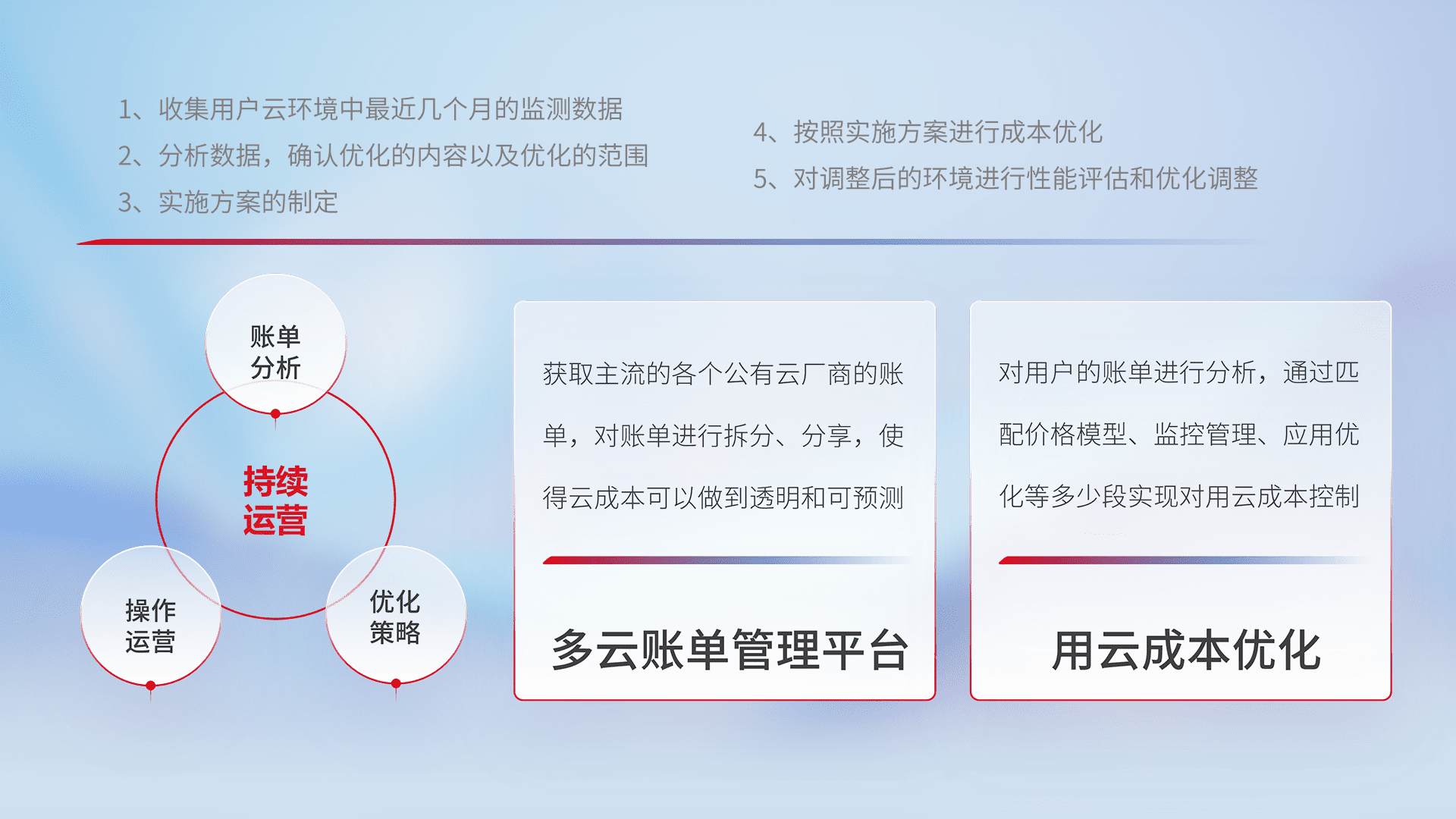 通过多云纳管,,以统一的资源数据模型把客户的云资源进行抽象和封装,,,进而实现对多云资源的统一操作,,,,保障云资源管理的可靠性、、稳定性与可用性。。。。量身定制化运维内容,,,配置、、开发运维、、补丁管理、、备份、、监控、、认证和访问管理、、、、审计和日常巡检等,,保障在用云过程中的可靠度,,,稳定度以及高可用率。。。。