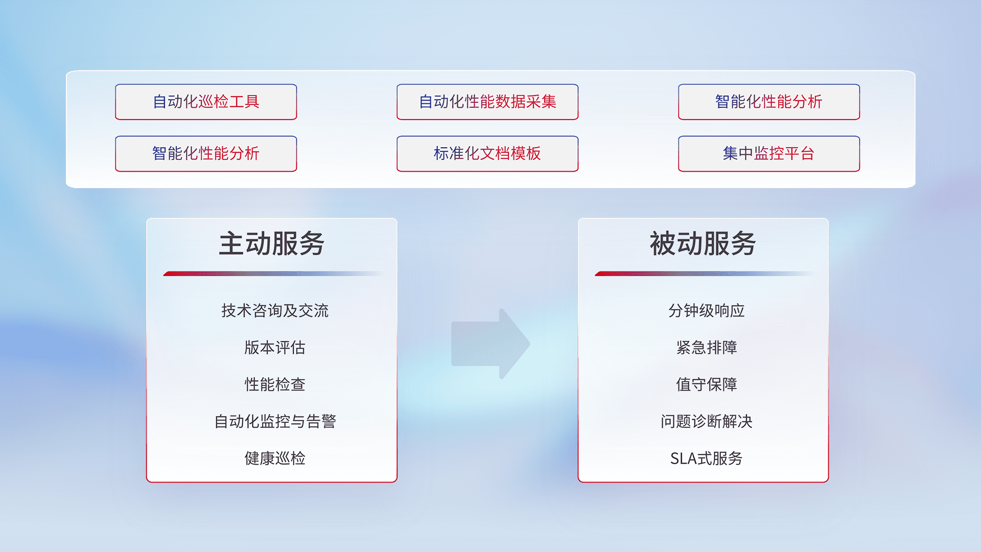 智能化工具和标准化文档,,,保障服务质量,,,提供主动服务(包含技术咨询、、版本评估、、、性能检查、、自动化监控与告警、、健康巡检)和被动服务包含(分钟级响应、、紧急排障、、、值守保障、、、、问题诊断解决、、、SLA服务)。。