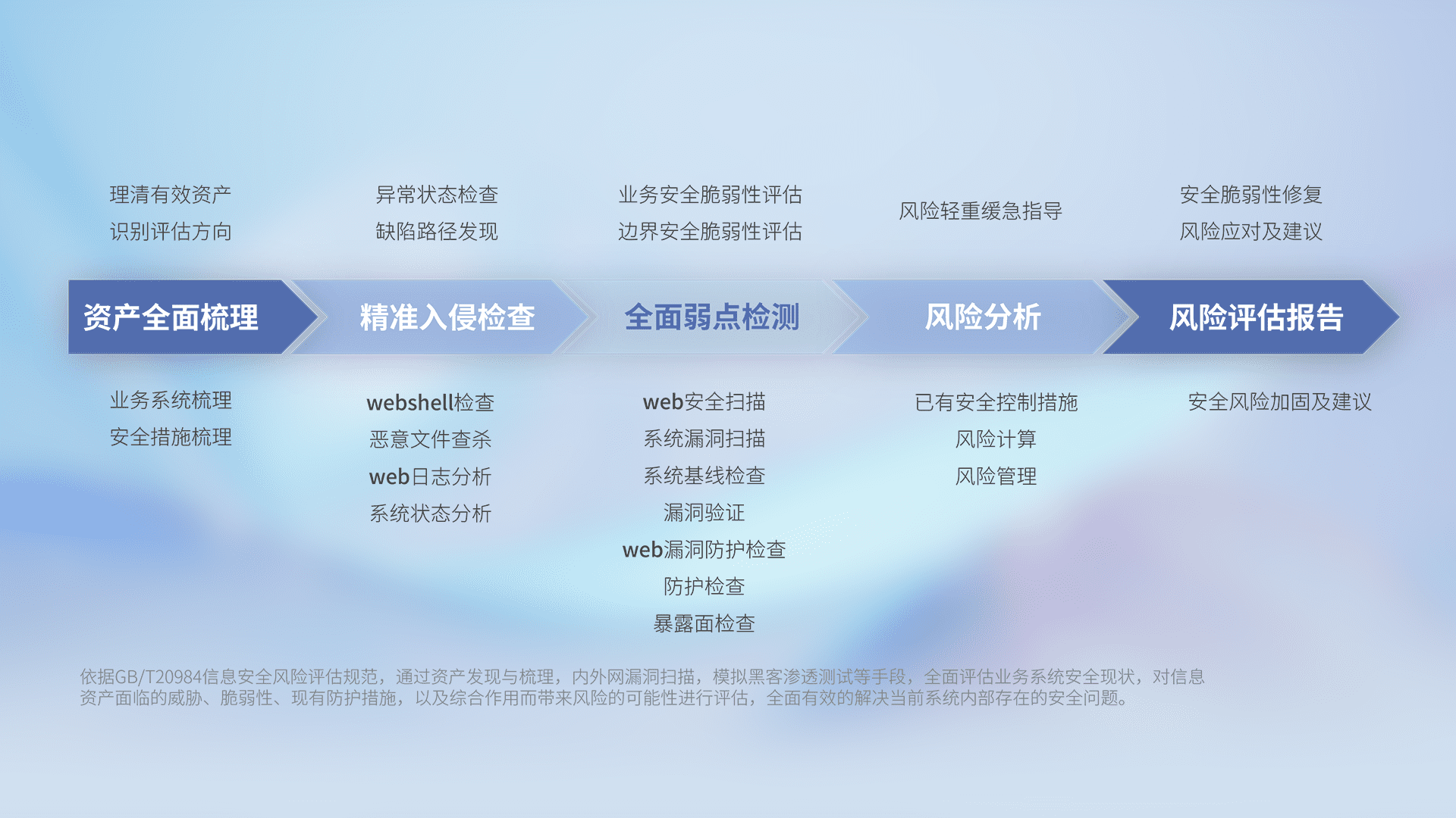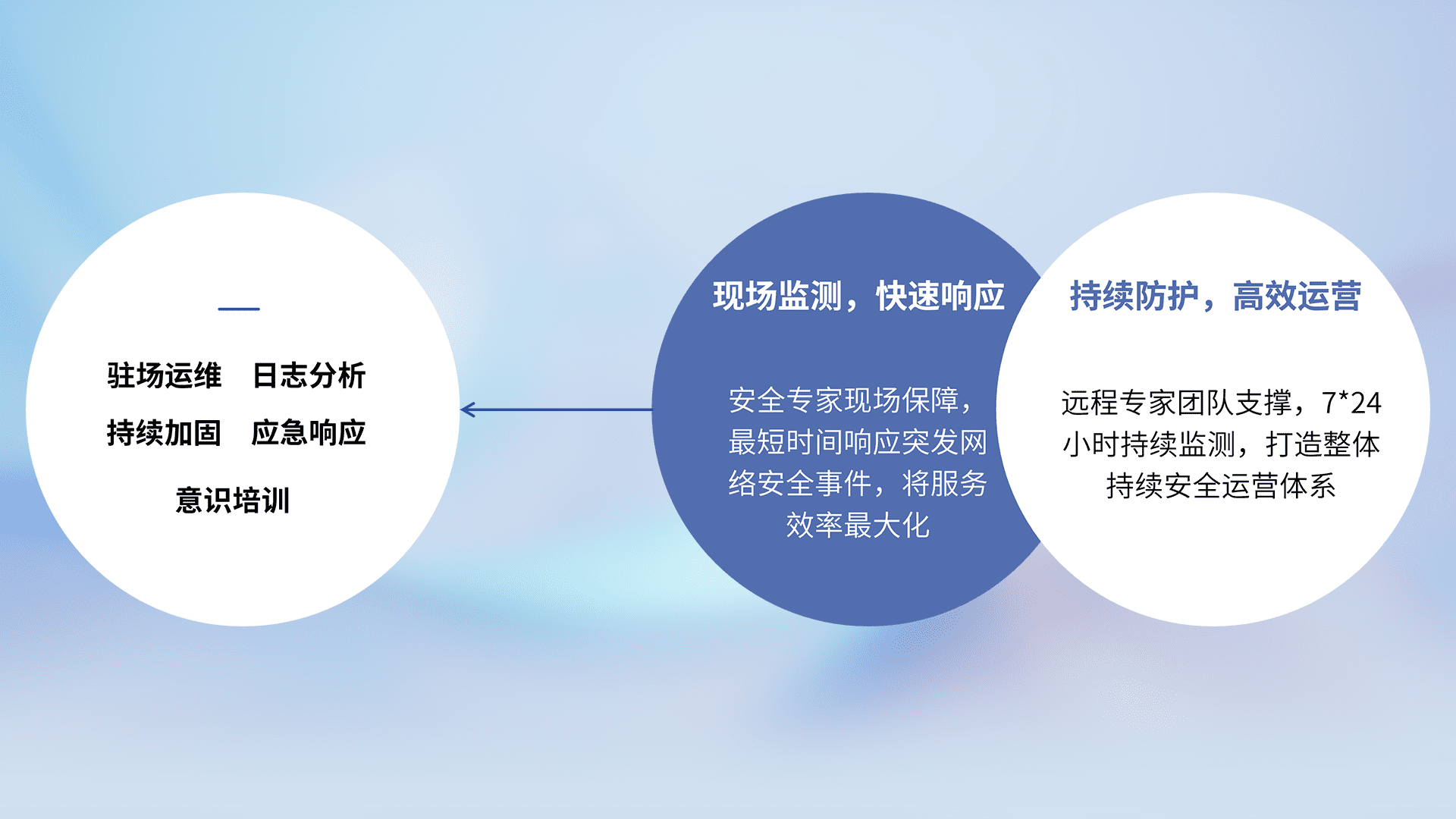 针对客户行业特性,,,,以专业的安全服务+多厂商联合解决方案提供专属的一站式安全管理服务,,帮助客户全面感知网络空间威胁,,,基于识别、、、、检测、、、、分析、、防护、、、、监测、、响应的服务理论模型,,从方案咨询、、、、集成交付、、、评估验证、、优化加固、、运维运营,,致力于为客户提供完整的闭环管理式安全服务。。。以实战经验为客户打造高抵御风险的安全体系,,,,帮助客户发现威胁、、、对抗威胁、、、、处置威胁,,,不断积累安全对抗能力,,持续保障数字化安全。。。